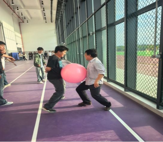 接下来的背靠背夹球趣味项目考验着团队的默契与协作。师生混合组队,两人一组背对背或面对面夹住气球,从起点向终点同步前进。赛道上,师生们步调一致、互相配合,有的队伍稳中求进,有的队伍因气球滑落引发阵阵欢笑,师生间的互动瞬间拉近了彼此的距离,展现了轻松融洽的师生关系。